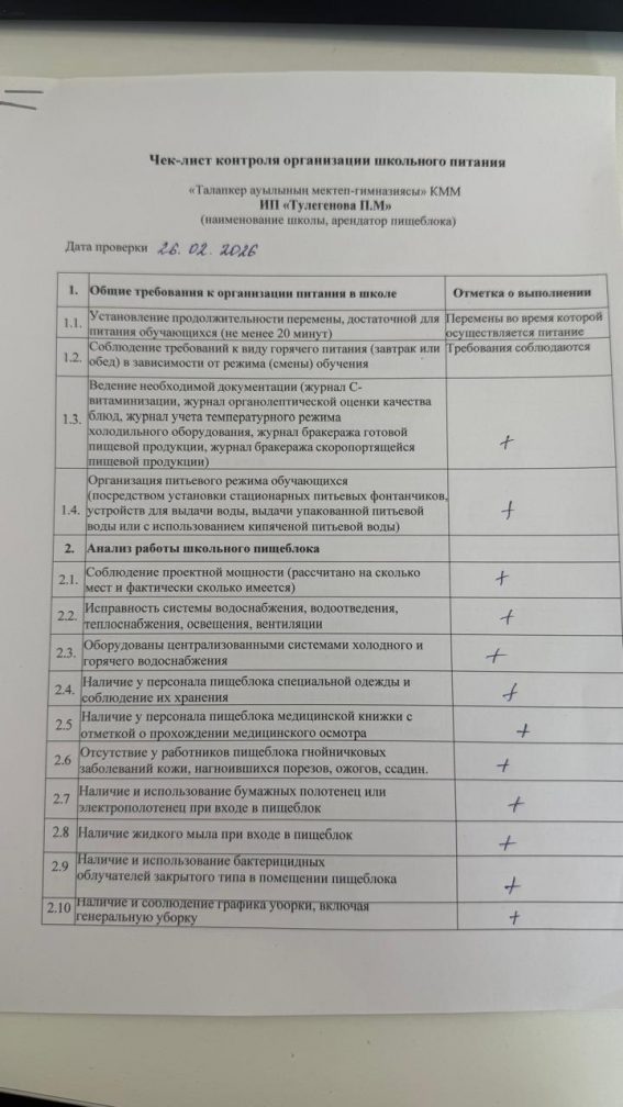 Тамақтану сапасына мониторинг жүргізу 26.02.2026