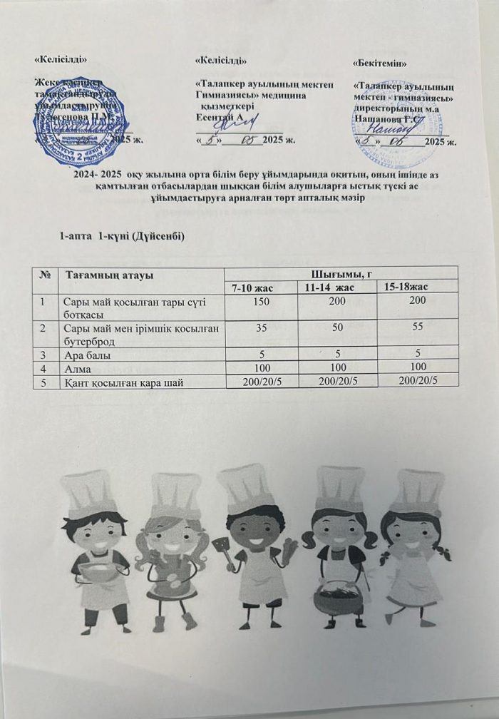 Мектеп асханасының ас мәзірі 05.05.2024