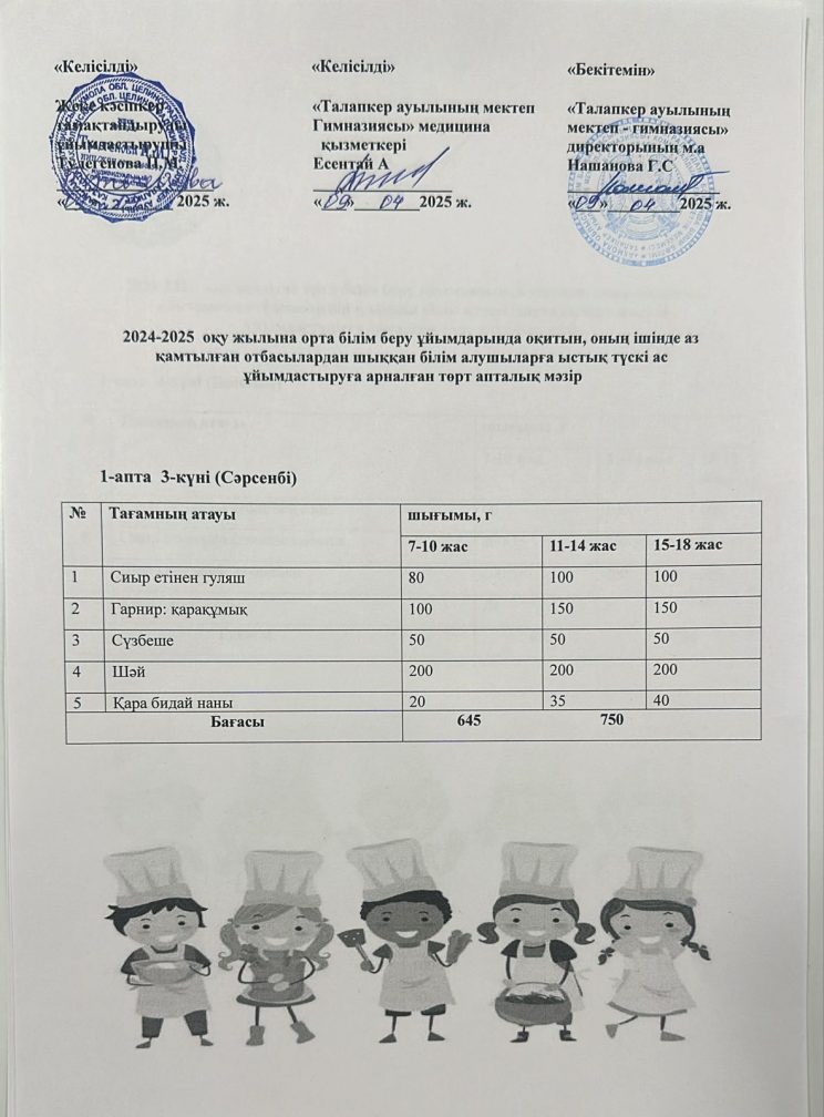 Мектеп асханасының ас мәзірі 09.04.2025